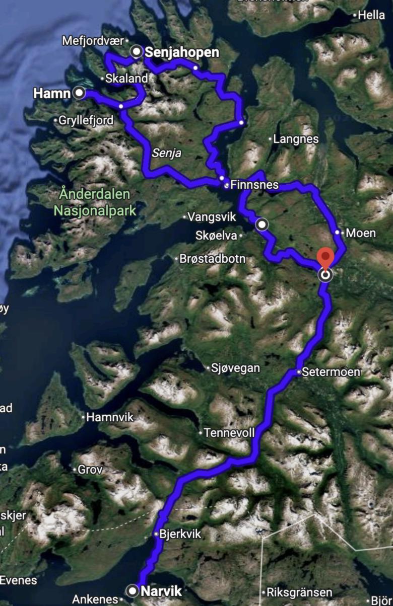 Neste etappe går over Saltfjellet med eit obligatorisk stopp ved Polarsirkelsenteret. Gjekk rundt ute i det fine veret og såg på det utstilte før eg heldt fram til Rognan for ny pause og lading. Vandra litt rundt i tettstaden medan bilen fekk påfyll. Budde meg på nesten 300 km til Narvik. Eg var rimeleg utkvilt og klar for eit nytt lengre strekk frå Rognan til Bognes ferjekai. Strekket etter Fauske til kaien er mykje opp og ned og att og fram med mange tunellar. Minner meg om vestlandsvegene eg er van med. Sidan eg bomma med nokre minutt på ferja, vart det eit lite stopp på Joker i Storjord for både meg og bilen.