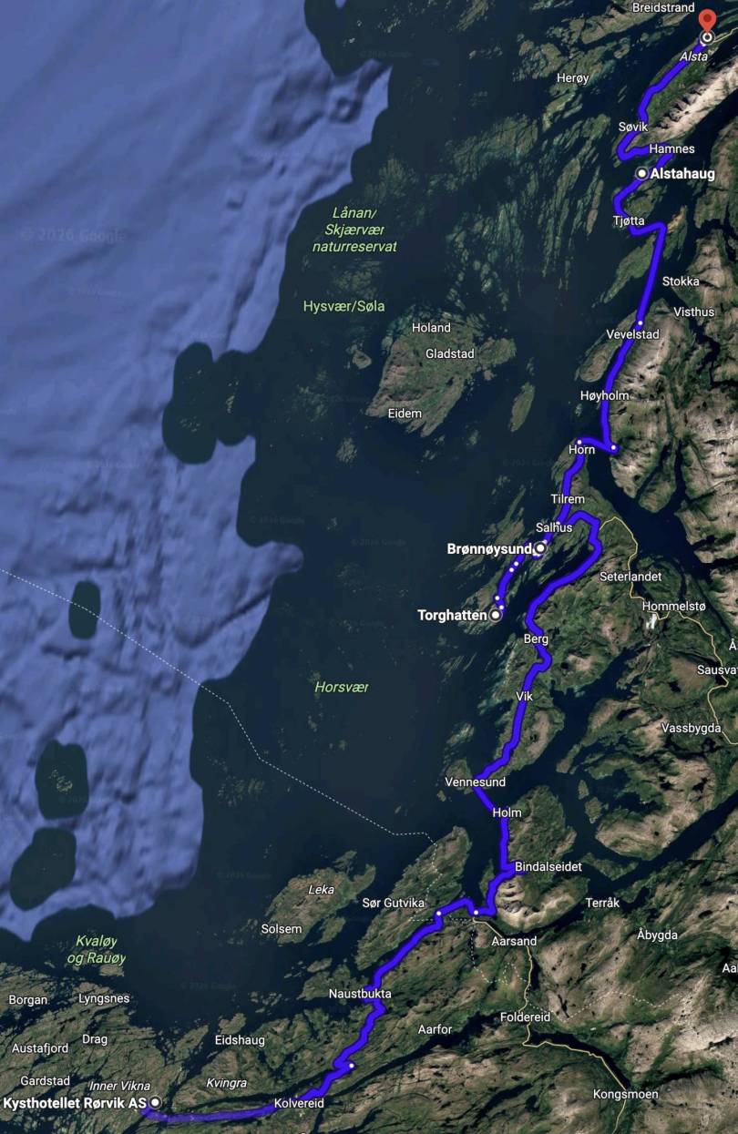 Veret var ikkje det store denne dagen. Vått når vi starta etter ein god frukost og ut dagen. Første etappe var å kome seg til Brønnøysund. Vi sette kursen for Holm ferjekai. Turen dit gjekk bra og sidan vi var tidleg var det ikkje problem å kome seg med ferja til Vennesund.