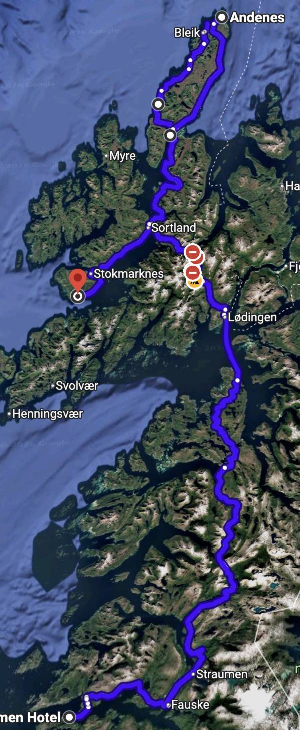 Tidleg ferje frå Melbu til Fiskebøl. Truen ned til Å gjekk ikkje etter strake vegen. Vi svinga av til høgre rett etter ferjekaien til Straumsnes og kom ut att på E10 sør om Laupstad. Køyrde innom og rundt Svolvær og såg oss om. Neste på planen var Henningsvær og den berømpte fotballbana ute bland stativ for å tørke fisk mellom bergnappar. Jammen var det mykje folk rundt omkring, turistar overalt. Både Svolvær og Henningsvær kunne samaliknast med ei maurtue.