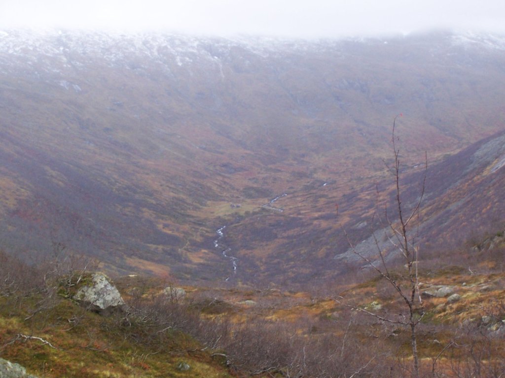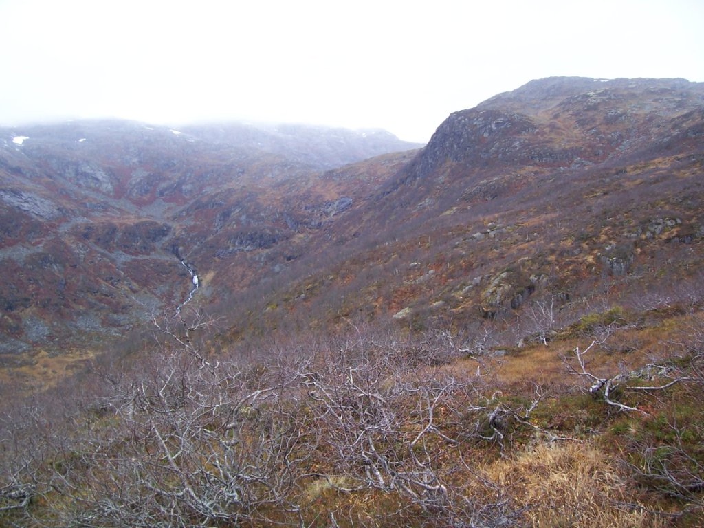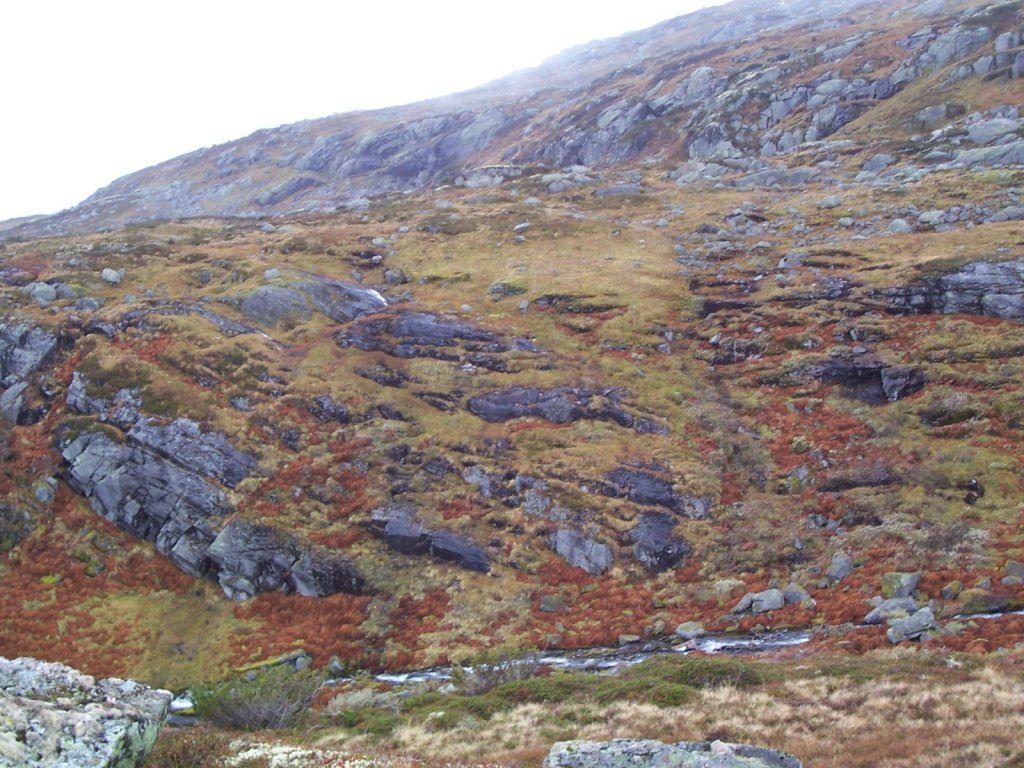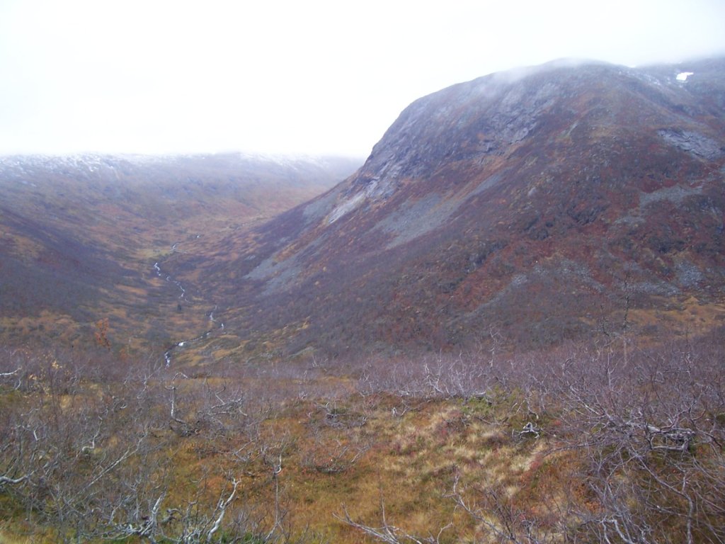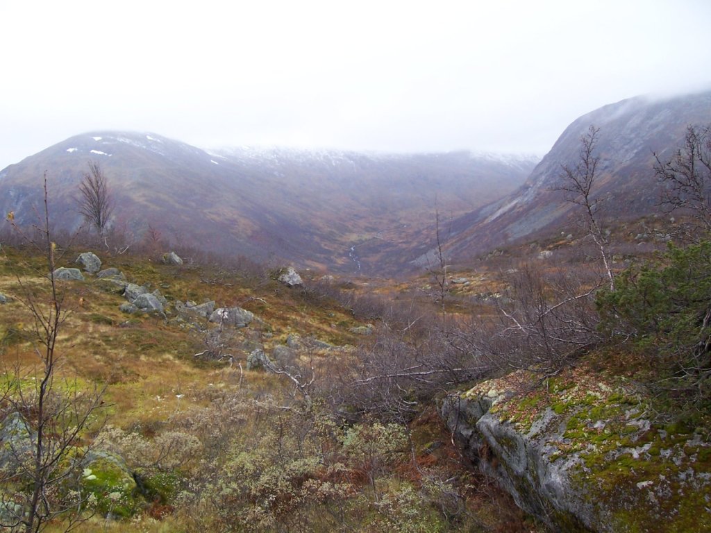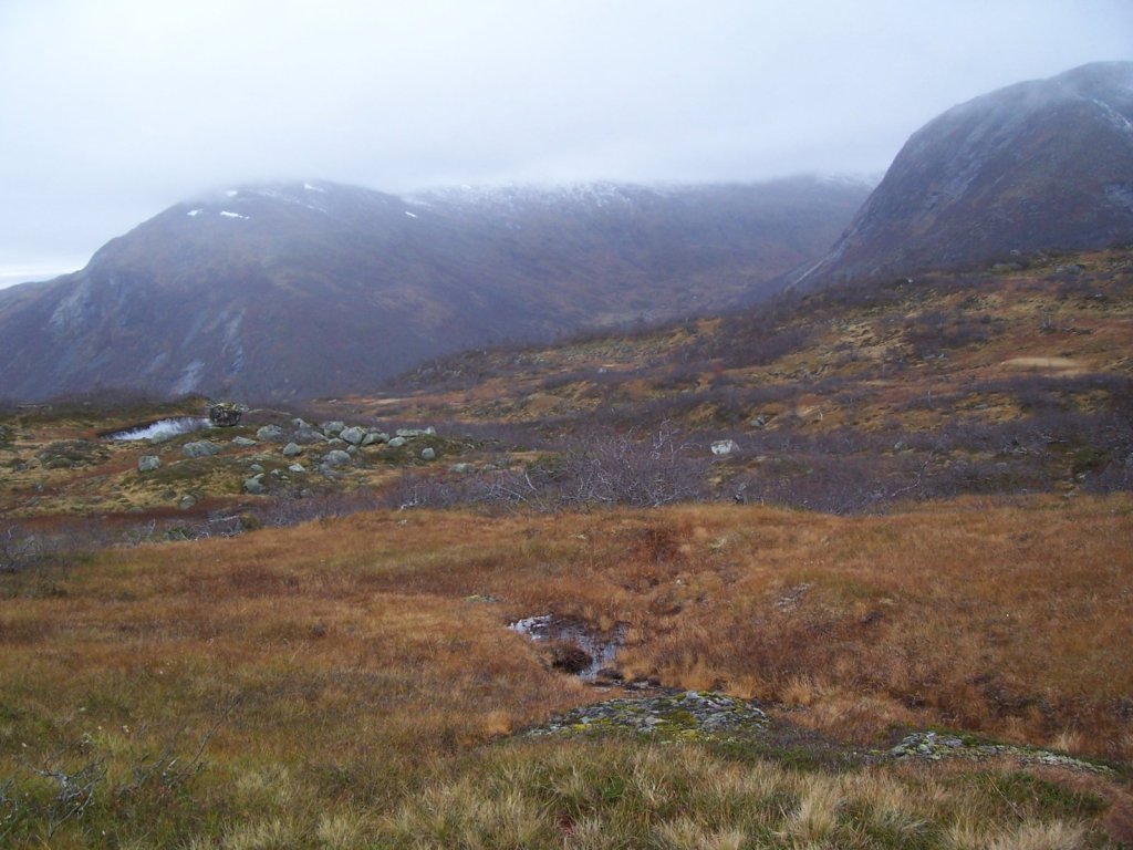 Veret var tungt og skydekke var lågt. Eg starta heimanfrå. Det er pur luksus å kunne starte ein lang fjelltur frå sitt eige hus. Turen gjekk fram Henjadalen fram til Flya på traktorveg. På Flya må ein krysse elva til stølsområdet på austsida og gå på sti framover mot Nyastøl. Det har regna mykje i haust og det er tungt og vått å gå. Når ein kjem fram tll Nyastøl, kan ein velje å gå ein litt kortare veg om Åsenosi eller ein kan gå opp til Pipehaug før ein snur framover i retning Trastadalen.