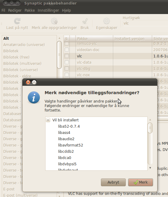Eg enda opp med min trufaste mediaspelar VLC som er tilgjengelege for dei fleste operativsystem. Han spelar så godt som alle format og ligg i pakkebrønnen til Ubuntu. Du søker etter vlc. Når du har funne pakken vlc, er det berre å høgreklikke for å installere. Alle pakkar som mediaspelaren er avhengig av blir automatisk merka for installasjon, men ta gjerne med plugin for Mozilla Firefox i tillegg.