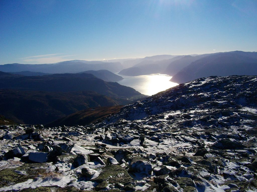 Framme ved vardane på Kjeringafjell har du utsyn mot Huks-/Grindsdalen i vest. I nordleg retning kan du sjå Kaldekletten og Voggebreen, som bidreg godt til vassføringa i Henjaelva. I austleg retning kan du sjå ned i Friksdalen som endar ut i Henjadalen ved Nyastøl og over mot Åsenosi, Trastadalen, Høgehaug, Sumhaug og Fjærlandsete. I sørleg retning ser du ned i Skuledalen og elva som renn ned mellom Sevi og Okslahaugane og renn ut i Henjaelva like nedom Fivelhola samt Hermansverk og Sognefjorden inn mot utløpet av Aurlandsfjorden, Fimreite og Fresvik.