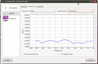 Eg har følgt med på batteritida i Ubuntu 10.04 med kjerne 2.6.35 kontra Ubuntu 11.04 med kjerne 2.6.38. Ubuntu 10.04 har ein del høgare straumforbruk. Eg er rimeleg sikker på at eg ikkje kan hugse at straumforbruket gjekk under 13 watt. Med Ubuntu 11.04 greier det seg rimeleg greitt ned mot 10 watt og dersom maskina får stå litt har det hendt at det duppar ned i 9 watt.