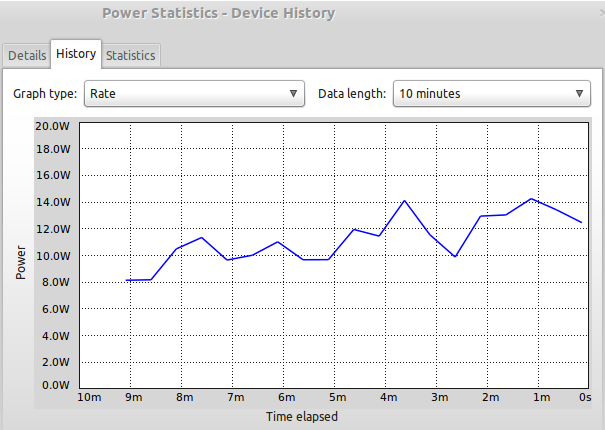 Eg laga til ein anna usb minnepenn med 64-bit-versjonen og gjorde det same. Her viste det seg å vere ein vesentleg skilnad. Når maskina stod i ro var straumforbruket heilt nede i 8 watt. Det ser du i starten av kurva under. Deretter surfa eg litt rundt på nettsider og logga meg inn på e-post med meir. Straumforbruket varierer, men sjølv med denne lette bruken min kjem det nett opp i 14 watt: