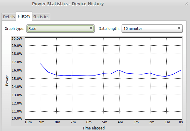 I 32-bit-versjonen av Linux Mint Debian Edition 201109 nyttar dei ein kjerne som òg støttar gamle 486-prosessorar, for oss som hugsar dei i første halvdel av 1990-talet. Alt fungerte greitt ved oppstart via USB. Det trådlause nettverkskortet i maskina, som eldre kjernar ikkje har innebygd, kom på plass. Eg opna straummålaren for å sjå korleis det stod til. Det var tydeleg at ting framleis ikkje var bra. Eg lot maskina stå i ro ei tid utan aktive program. Straumforbruket gjekk aldri under 15 watt: