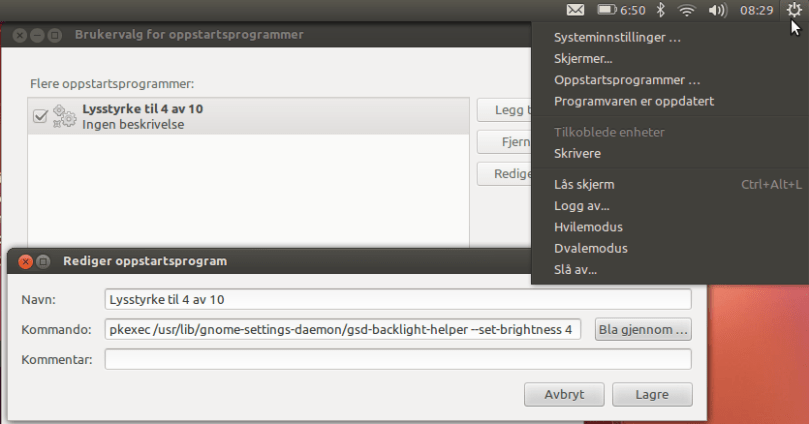 På skrivande tidspunkt hugsar ikkje Ubuntu 12.04 innstillingane for lysstyrke på skjermen. Kvar gong du startar maskina, blir lysstyrken slått på fullt på innloggingsbilete. Slik blir held lyset seg etter innlogging, med mindre du justerer det ned. Løysinga går ut på at du for kvar brukar på maskina legg du inn under oppstartsprogrammer følgjande kommando: