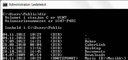 For å vere sikker på å ha alle rettar ved oppretting av lenker, må du starte Ledetekst frå Start-knappen – Alle programmer – Tilbehør – Ledetekst. Det er viktig at du høgreklikkar på Ledetekst og veljer Kjør som Administrator. Deretter brukar du kommandoane cd og dir for å navigere deg rundt og sjå deg om.