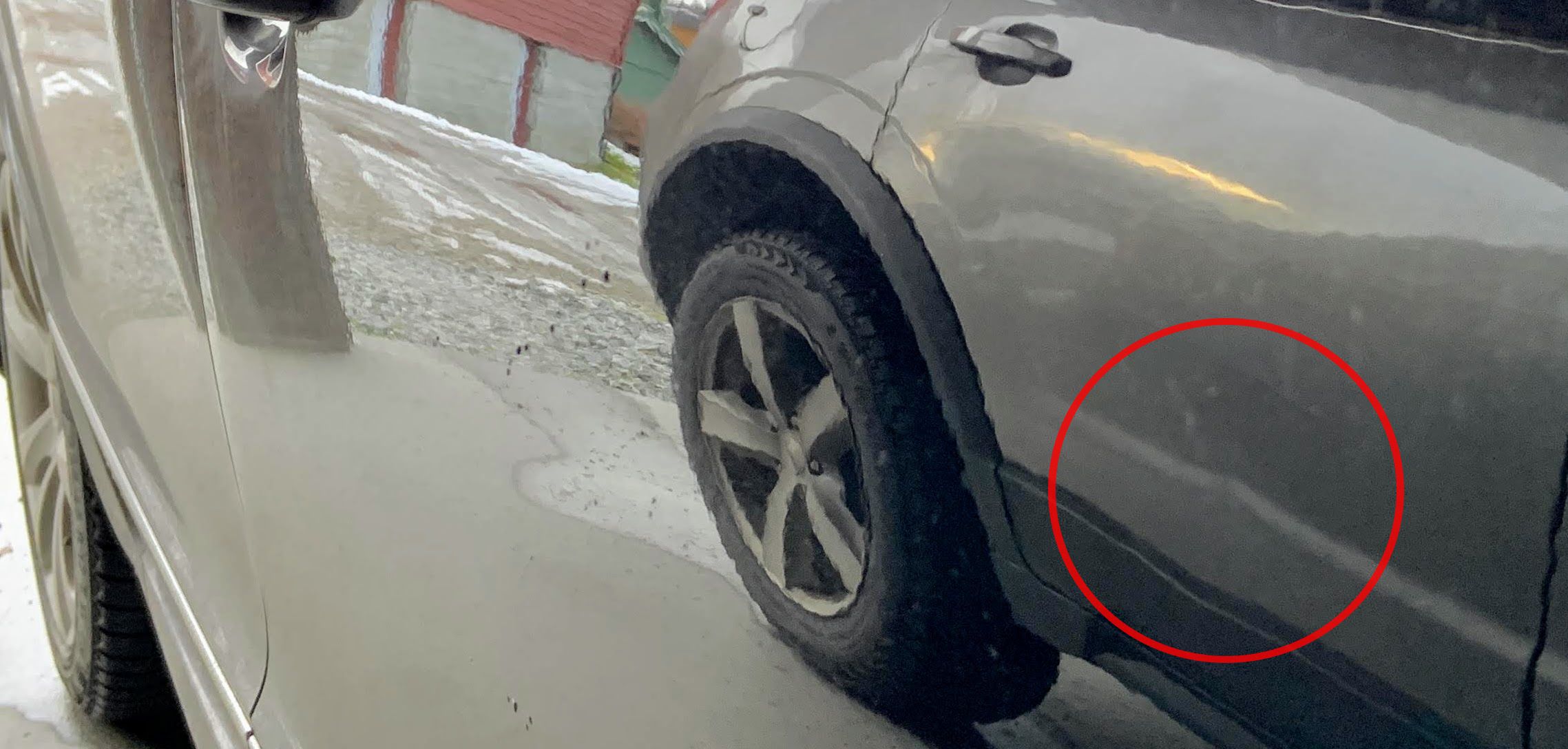 Eg vaska skadeområdet godt, for betre vurdere skada og om eg kunne gjere noko. Første forsøk var å polere lakksåra eit par gonger, som virka til å fungere rimeleg bra. Eg får følgje med utover våren. Om det ikkje er nok, kan det vere aktuelt å gå på med rubbing med påfølgjande polering. Det eg ikkje får bort, er den svake bulken. Det er ikkje lett å fotografere eit svart, polert område, men du ser brytinga i speglbilete av bilen som står attmed.