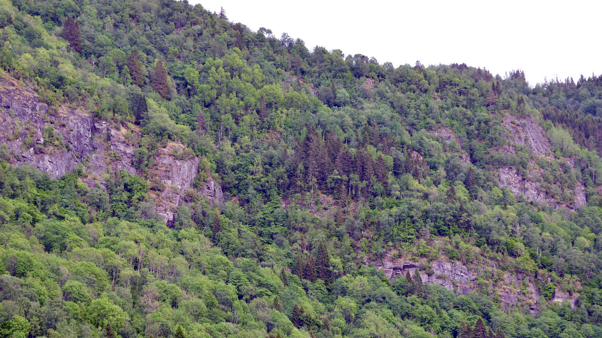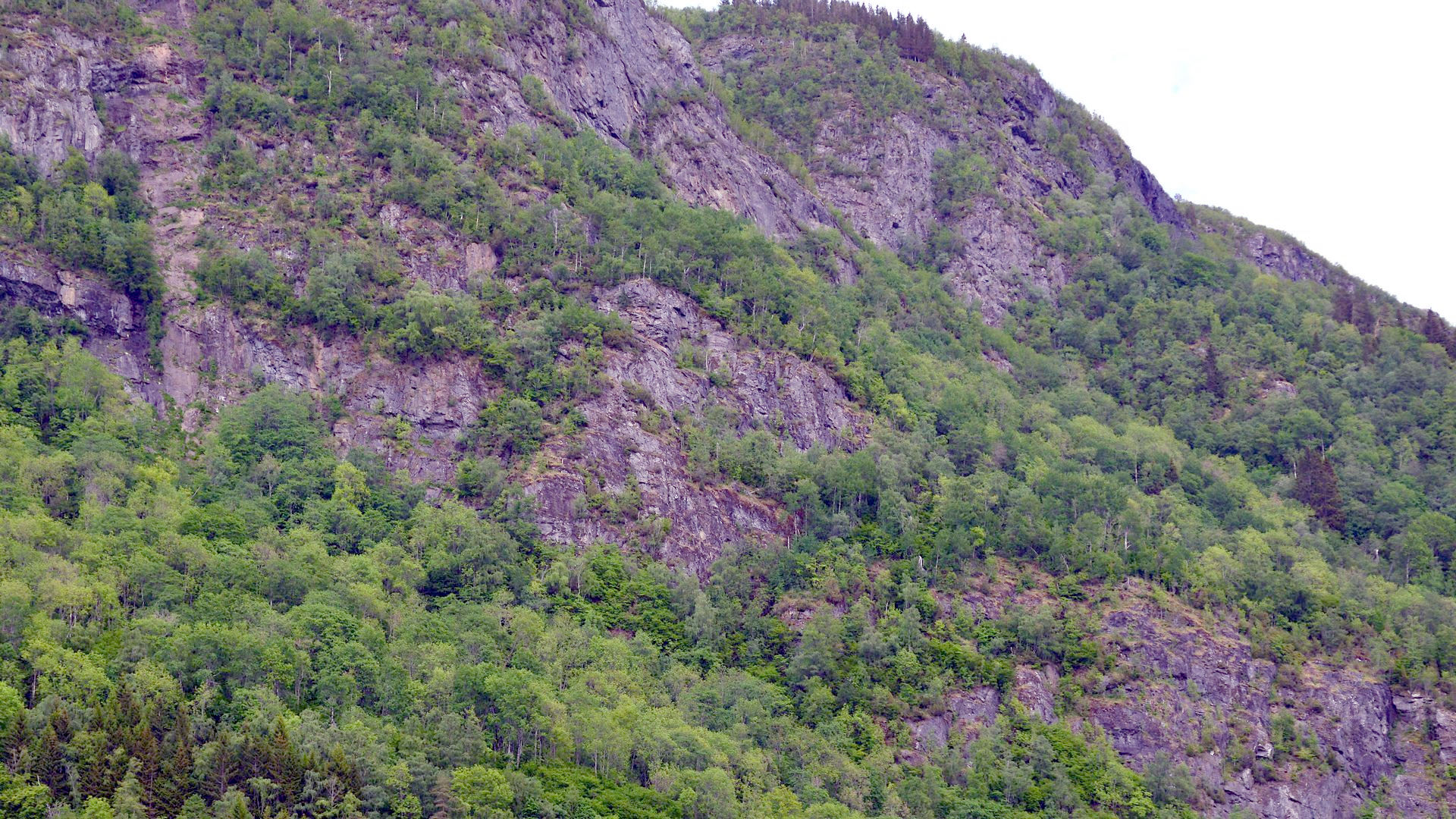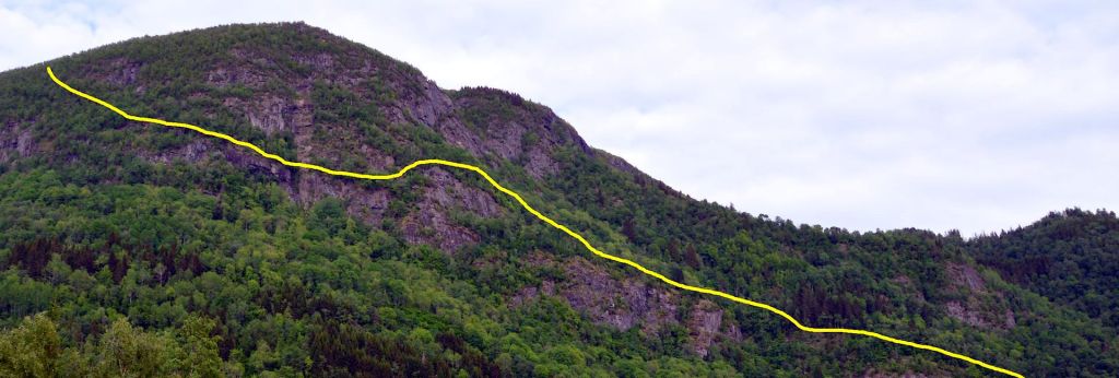 Ser du fjellområdet nedanfrå, ved Henjabrua eller heime på Njøs, kan du ikkje tru at det gjekk an å gå i fjellsida. Sjølv med nerver av stål er det lite sannsynleg at du kan gjennomføre turen i dag. Ein del av fjellsida, som du ser i venstre tredjedel av bilete over, lausna for ein del år sidan. Det tok med seg ein vesentleg del av hylla som stien gjekk over. Bileta under tek deg litt nærare inn på området (frå sør til nord) samt rasrenna: