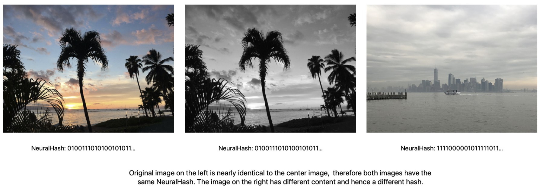 Legg merke til at ein går på visuelle i bilete. Ein svart/kvitt-versjon av same bilete generer tilsvarande hash. I tillegg vil same bilete litt skore til eller med endra oppløysing få same hash.