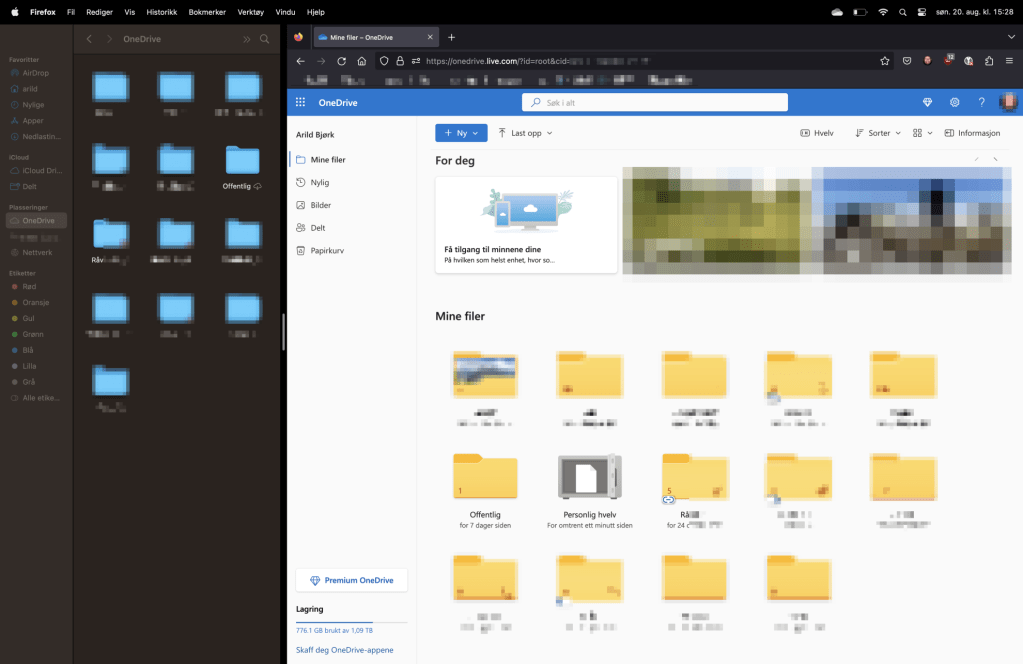 Om du ser på bilete under, vil du sjå at mappa «Personlig hvelv» ikkje eksisterer i Finder på Mac. I Finder ser du mappa Offentlig før neste Rå…. (alfabetisert). I nettlesaren ser du at «Personlig hvelv» ligg mellom desse to mappene.