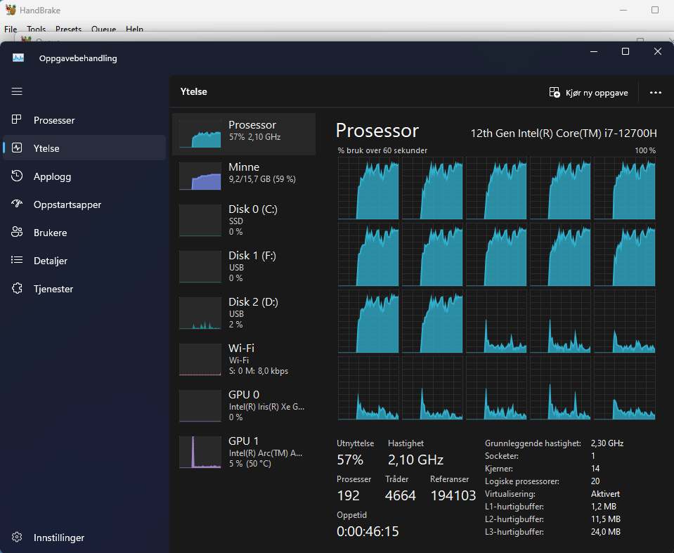 Ikkje overraskande vart AV1-filene frå Intel QuickSync større enn programvaremessig koding. Eg stussa på kvifor programvaremessig koding med Handbrake tok veldig lang tid. Når eg tok opp ressursoversikta i Windows, virka det ikkje som prosessoren løyste sveitten. Han låg på under 50% av kapasitet, sjølv om eg fora han frå SSD. Overføringsfarten var ikkje flaskehalsen. Eg gjorde den same testen på Ryzen 7 5800u. Her låg prosessoren tett opp under 100%. Noko stemte ikkje Intel-prosessoren. Under ser du svaret: