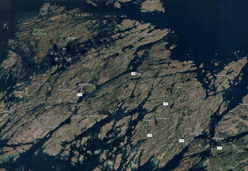 Ein kan ikkje kaste vekk kvelden. Etter mat og ein pause frå dagens køyring med ei vandring rundt i Rørvik, fann vi ut at det var mykje spanande å sjå på øynene utom Rørvik. Vi sette oss i bilen og valde å bruke eit par timar med å vere inn Lauvøya, Lyngsnes og Valøya. Var det veg dit var vi der, om eg ikkje hugsar feil. Minnes Lyngsnes med rasteplass på neset var fint. Utsikt ut mot holmar og skjer i nordleg retning.