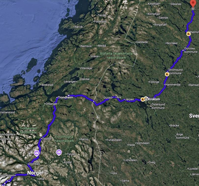 Som vanleg starta det med tur over Sognefjellet, Dombås og nordover. Sidan eg har posta det meste tidlegare, har eg denne gongen valt å starte turen frå Berkåk. Mot Stjørdal går det greitt, men trafikken var stor. Han vart nokon mindre når eg svinga austover i Stjørdal, men det var først når eg var over i Sverige at ting avtok. Vegane vart også betre med tanke på forbikøyring av dei som valde å køyre sitt eige løp. På den andre side var det mindre å sjå og meir skog.