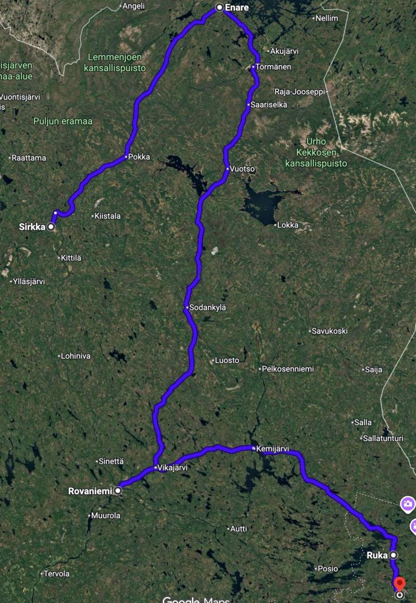 Hugsa problemet skiløparane hadde med å koma seg frå Kuusamo og Rovaniemi ein vinteren for litt sidan. Islagde vegar gjorde at det tok timevis. Eg plotta inn skistaden Ruka og Kuusamo og sette avgårde. Kryssa austover gjennom skog og langs vatn. Rein vandra i og ved vegen til tider. Kamera fekk heteslag ein kort periode. Ruka var som Sirkka ein stad rundt eit fjell eller ein høg ås. Her var det ulike former for skiaktiviteter, eit slags kompakt Geilo. Deretter var det å ta turen litt lenger søraustover til Kuusamo. I motseting til Ruka var ein her tilbake på «flatbygda». Fann meg ein rimeleg overnattingsstad i utkanten Kuusamo.