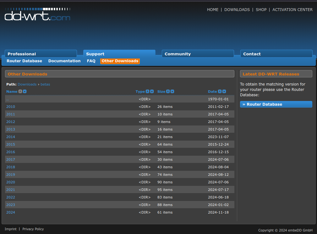 Eg trudde DD-WRT var daudt, men i går søkte eg litt og fekk med meg at ein person opplyste at databasen på sida ikkje vert oppdatert. Om ein går inn på «Other Downloads«, som du ser heilt til høgre i lina med den oransje knappen «Router Database» med kvit skrift, vil du finne filstruktur med nyare versjonar: