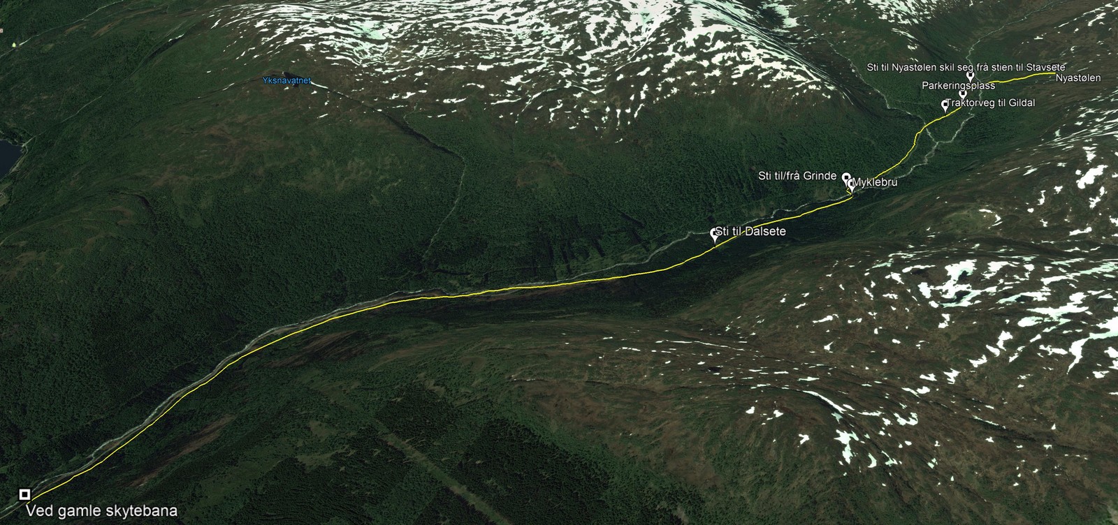 Eit alternativ vere å gå tilbake mot Nyastølen. Brua litt i aust/søraustleg retning frå stølsområdet. Om du ser mot Kaldekletten og Kjeringafjell, vil du kunne sjå brua. Etter at du har kome deg over Stavsete, må du opp litt for å kome over Bleiehaug, under Kaldekletten. Frå Nyastølen kjem du ned att til utgongspunktet for turen.