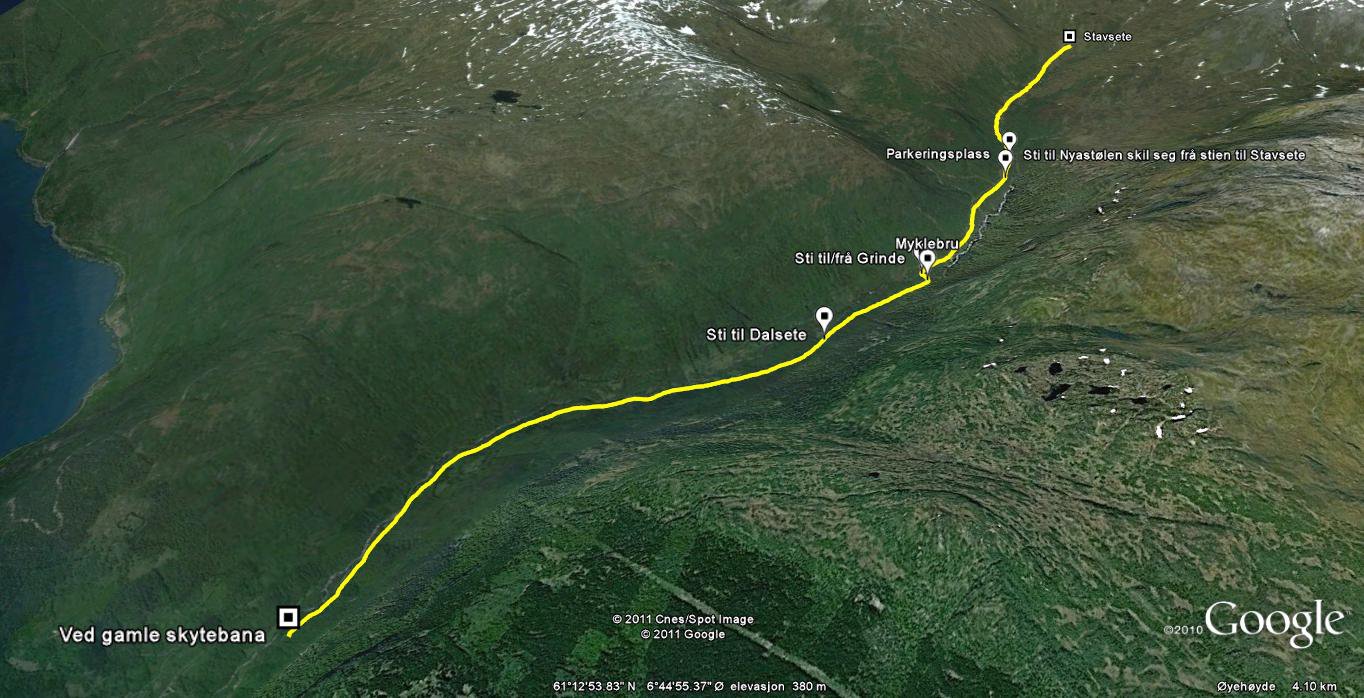 Kik gjerne bortom bekkainntaket på vegen fram. Når du nærmar deg toppen på vegen, vil du sjå Stavsete, framme på høgre side. Gå ut av vegen og sikt deg inn på den vesle brua som let deg tørrskodd kryssa elva Reppa. Stavsete ligg i eit ope området under mellom anna Stav og Kaldekletten.