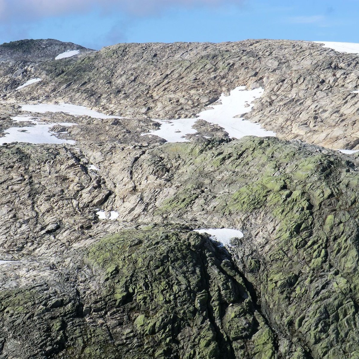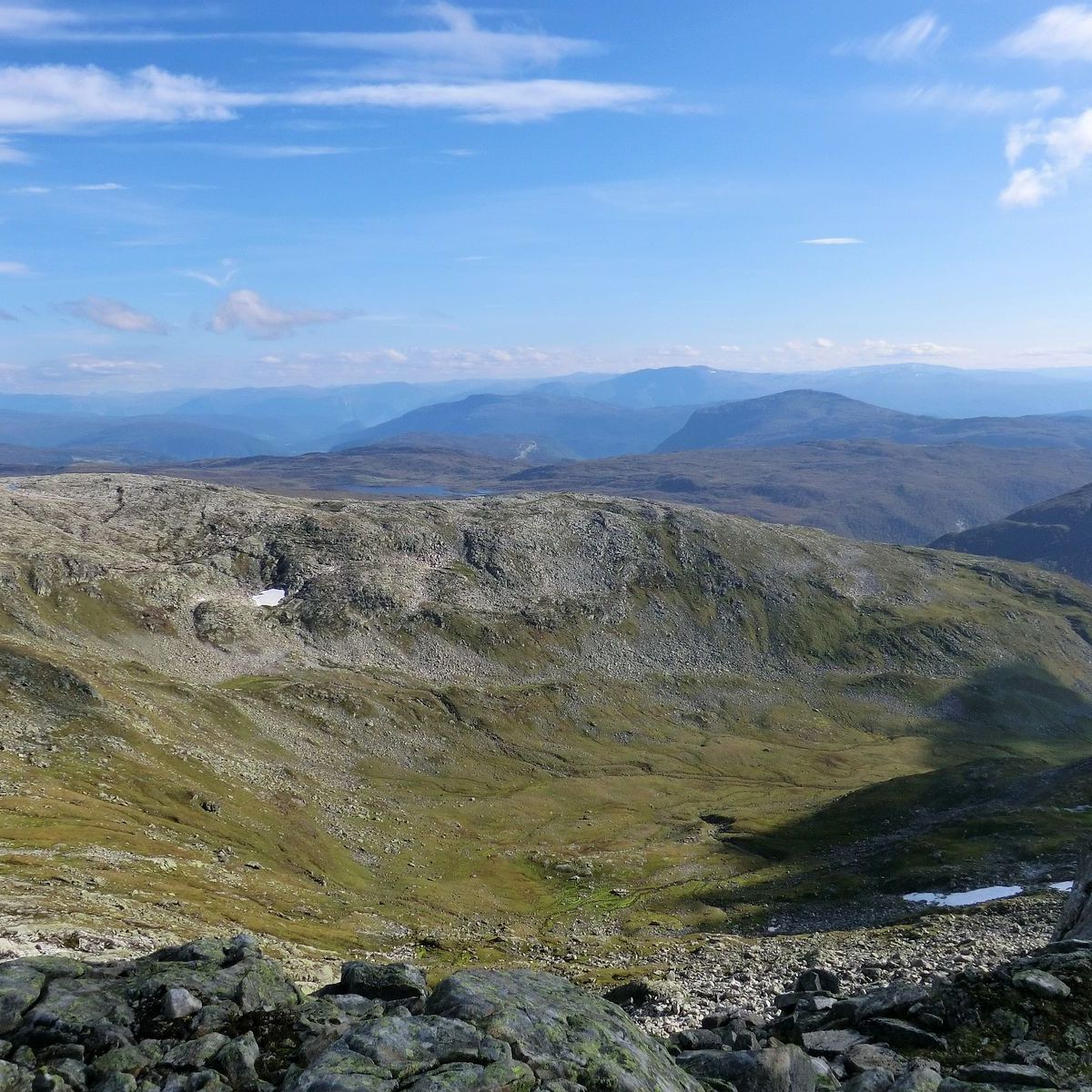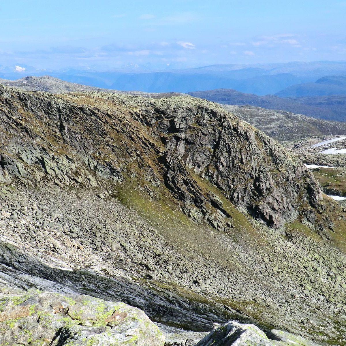 Som sagt 2/3 og du er fri skogen. Du kan snu deg å ta ein titt over Henjadalen, Myrdalen, Høgehaug, Pipehaug, Hovden, Sumhaug og Fjærlandssete. Deretter er det å følgje raudmerka opp mot toppen. Det er bratt og fjellet har ein avrunda stigning som dabbar av etterkvart som du kjem opp. Det kan gjere det utfordrande for oss med høgdeskrekk når ein ser seg bak. Du får kjensla av at det er «farlegare» enn det faktisk er. Mot slutten mista eg raudmerka, men sidan eg hadde studert kartet, visste eg kor eg skulle. Det var godt med pause og niste ved det gamle flymerke.