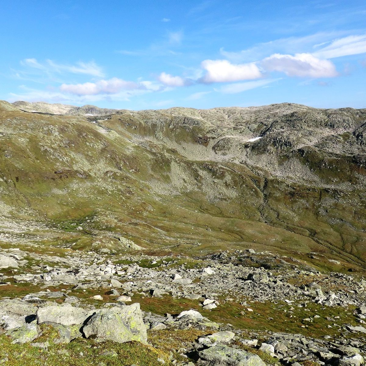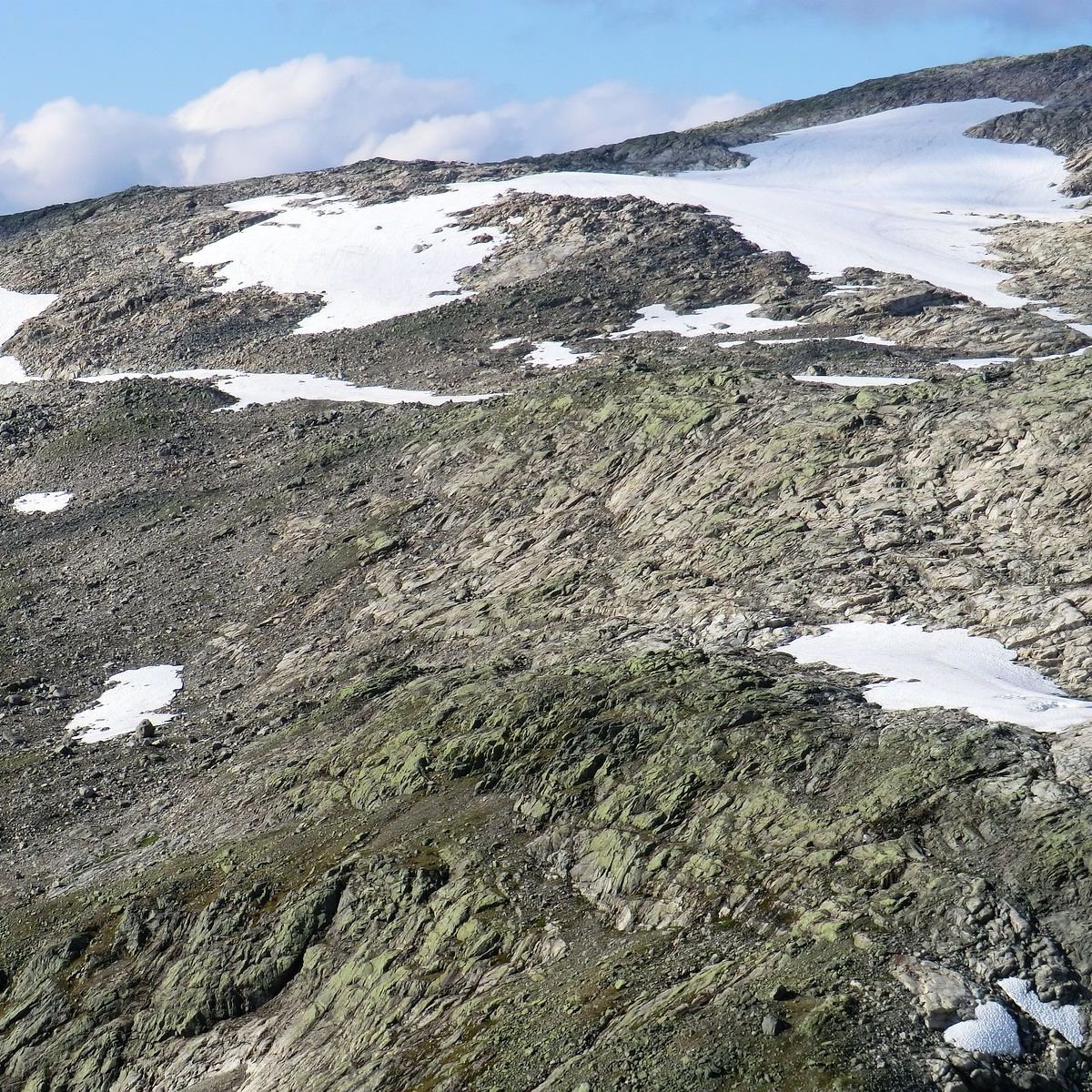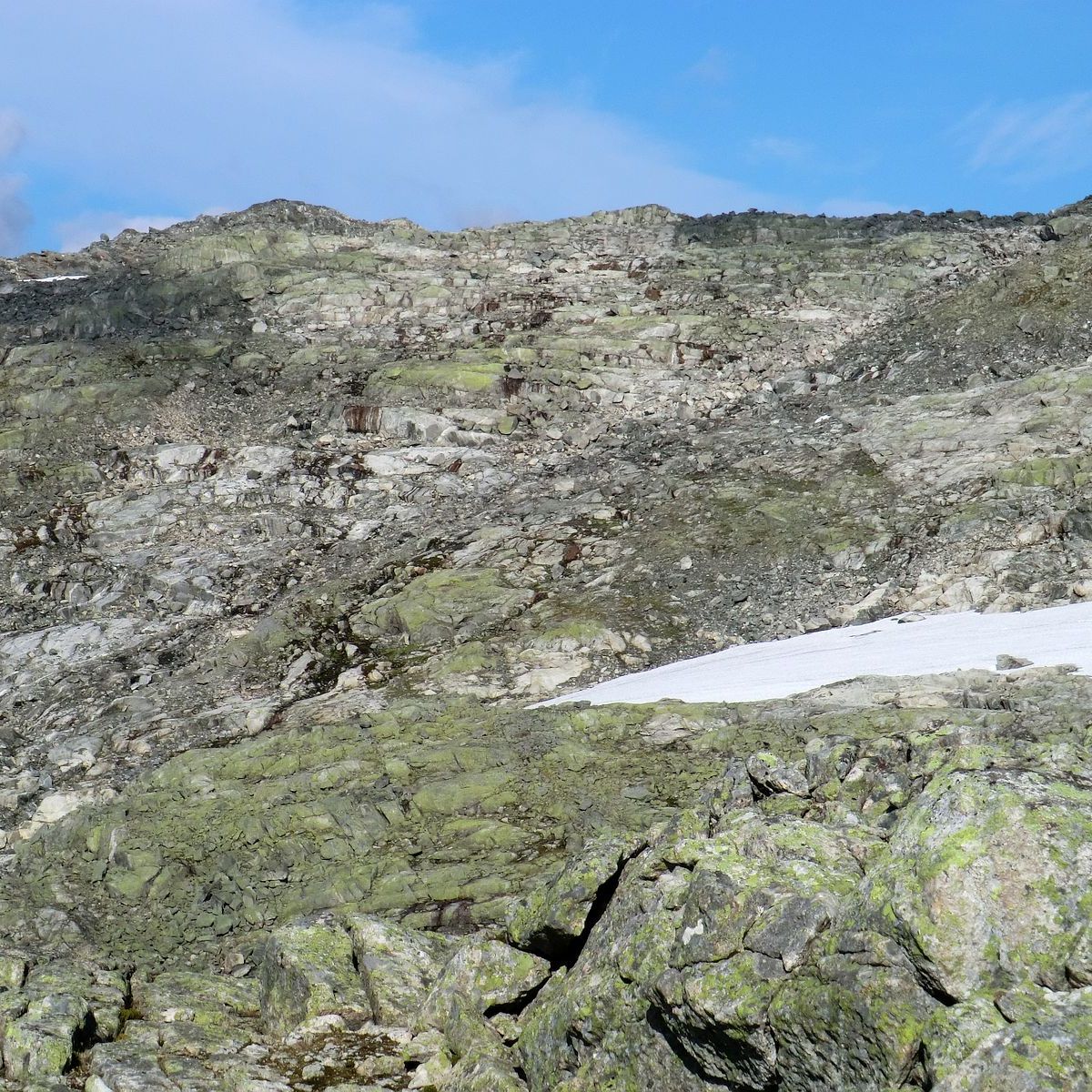 Som sagt 2/3 og du er fri skogen. Du kan snu deg å ta ein titt over Henjadalen, Myrdalen, Høgehaug, Pipehaug, Hovden, Sumhaug og Fjærlandssete. Deretter er det å følgje raudmerka opp mot toppen. Det er bratt og fjellet har ein avrunda stigning som dabbar av etterkvart som du kjem opp. Det kan gjere det utfordrande for oss med høgdeskrekk når ein ser seg bak. Du får kjensla av at det er «farlegare» enn det faktisk er. Mot slutten mista eg raudmerka, men sidan eg hadde studert kartet, visste eg kor eg skulle. Det var godt med pause og niste ved det gamle flymerke.