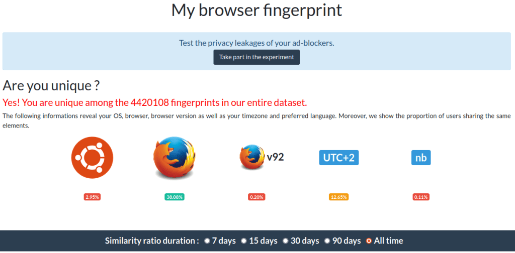 Kombinasjonar av all informasjon som vert henta ut frå nettlesaren gjer meg unik. Berre det at eg køyrer Ubuntu 20.04 snevrar meg inn til kun 2,95% av datasettet, som omfattar alle som har køyrt testen. Det er enkelt for Google å følgje meg etterkvart som eg forflyttar meg rundt på nettet.