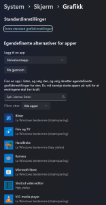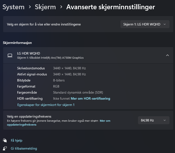Eg tenkte først eg hadde endra innstillingar i Windows som følgje at testinga rundt Need for Speed: Hot Pursuit (2010). Mellom anna hadde eg testa spelet med prosessoren sitt grafikkort (Intel Iris Xe Graphics) for å sjå om det var Intel Arc-kortet som skapte problema. Eg gjekk over alle innstillingar i Windows for spel og skjermkort. Dei eg meinte kunne ha påverknad vart justert. Alt såg korrekt ut, men det fungerte ikkje. Etter ein kik på avanserte skjerminnstillingar slo det meg.