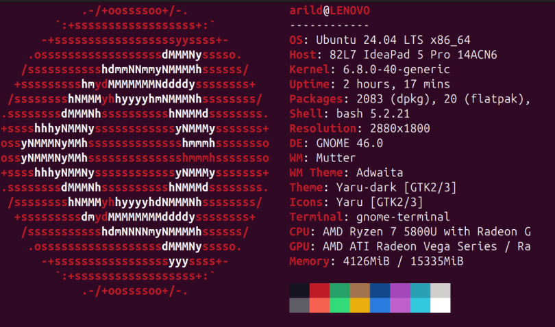 Å installere Ubuntu er enkelt frå ein minnepinne. Eg er rimeleg nøgd med standard oppsett av Ubuntu 24.04, men har gjort nokre tilpassingar: