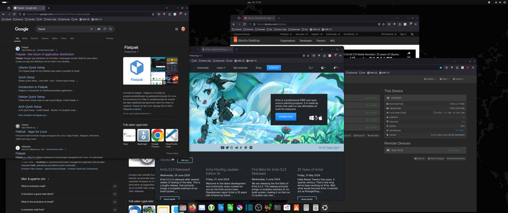Årsaka til at eg gav LMDE eit forsøk, var valet Canonical har gjort med tanke på levering av programvare. Dei har etablert Snap til distrubering av programvare, medan mange andre satsar på Flatpak. I mine første spede forsøk med Ubuntu 24.04, la eg merke til at Snap hadde utdatert versjonar av flere program eg nyttar. Siste offisielle versjonar var på plass i Flatpak. Løysinga er likevel enkel for Ubuntu 24.04. Det er berre å installere Flatpak og eg kan no fritt velje mellom installere frå Snap eller Flatpak. Så lenge batteritida er god, kan eg leve med andre «skavankar». At Ubuntu 24.04 er sikra støtte i 12 år er heller ikkje noko å kimse av.